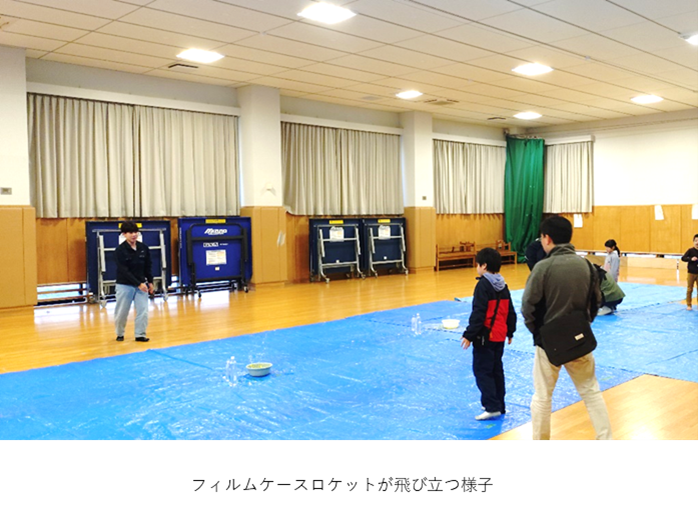 当日は屋外での打ち上げを行なうペットボトルロケット教室を開催する予定でしたが、あいにくの雨天により、構内の川内サブアリーナでのフィルムケースロケット教室へと変更になりました。